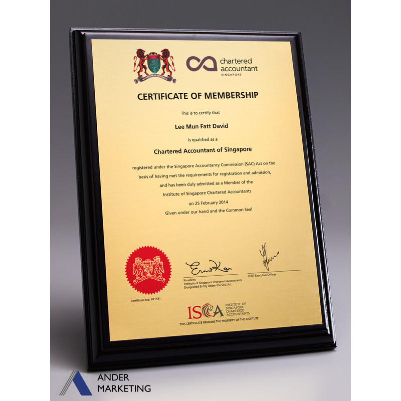 Plaque for the Chartered Accountant of Singapore certificate.