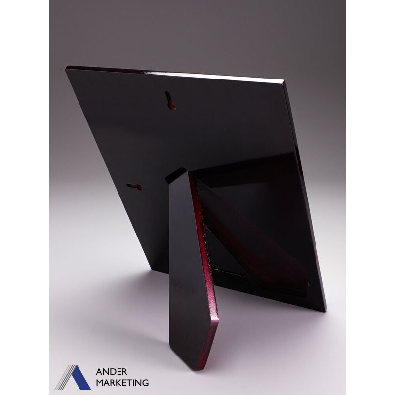 Custom printed on a gold-coloured aluminium metal plate mounted on a maroon MDF wood backing.