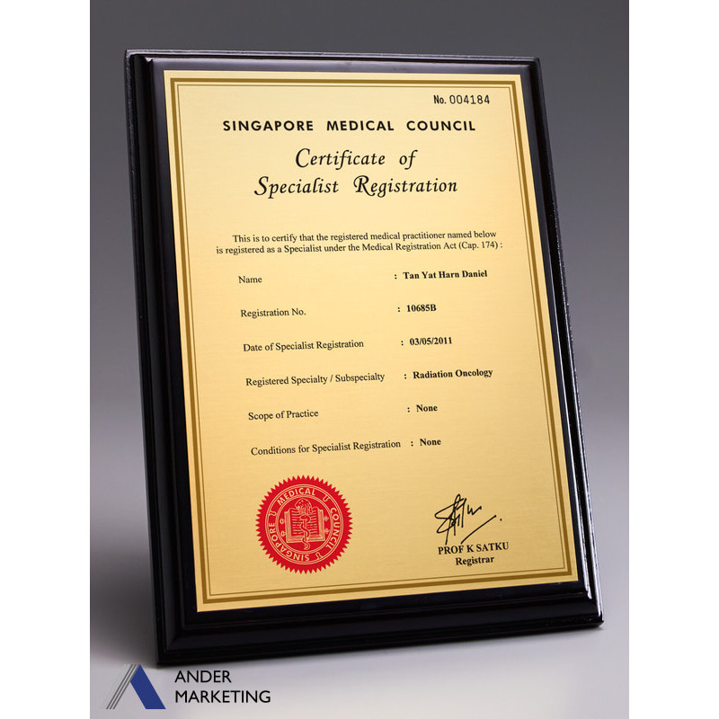 Plaque for Singapore Medical Council (SMC) professional registration certificate.